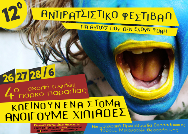 Η ανάγκη να έχιε πολλούς επισκέπτες αυτό το αντιρατσιστικό φεστιβάλ, είναι μεγαλύτερη από ποτέ. Με τους νέους νόμους και τα νέα ήθη που επιβάλλονται από την πολιτεία, σε μια προσπάθεια όχι να δώσουν λύση σε ένα πρόβλημα, αλλά απλά να ικανοποιήσουν τα αισθήματα μιας μερίδας πολιτών, έχουν τσουβαλιάσει τους πάντες κάτω από την επιγραφή μετανάστης. Το φεστιβάλ προσπαθεί να δώσει φωνή σ’ αυτούς τους ανθρώπους, εσείς πάτε απλά και ακούστε τους. Ένα εντυπάκι σε μορφή pdf που κυκλοφορούν τα παιδιά μπορείτε να πάρετε και από εδώ.