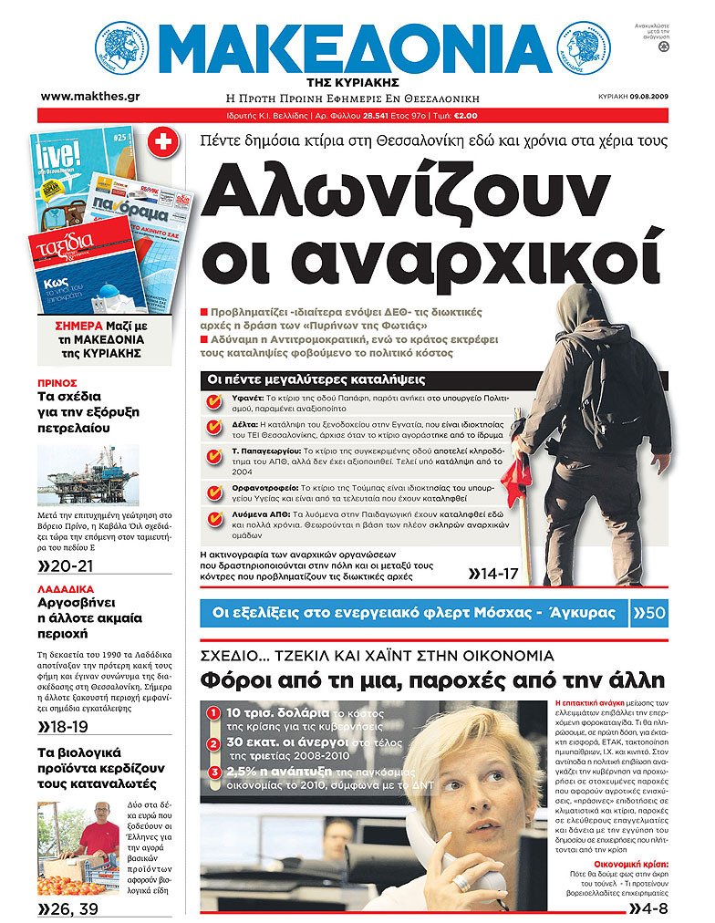 Η σημερινή “Μακεδονία” έχει στο κεντρικό της θέμα (σελ. 14-17) τις καταλήψεις 5 κτιρίων της Θεσσαλονίκης τις οποίες τις συνδυάζει με την ΔΕΘ αλλά και με τις πρόσφατες επιθέσεις με εκρηκτικούς μηχανισμούς και γκαζάκια. Προς το παρόν δεν έχω link μια και το διάβασα στην εφημερίδα, μόλις τώρα (1:30 το πρωί) αύριο θα βάλω και τα Link όταν σηκωθεί η εφημερίδα.