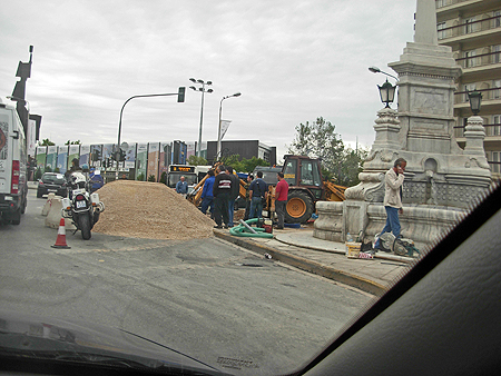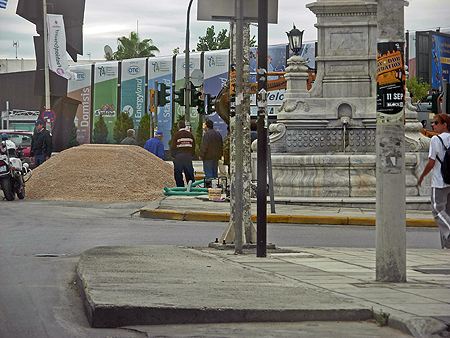 ΣΤις φωτογραφίες που ακολουθούν και τραβήχτηκαν στις 9 το πρωί σήμερα. Βλέπετε έναν δημοτικό αστυνομικό να παρίσταται δίπλα από το συνεργείο. Αστυνομικοί δεν υπάρχει πουθενά. Γιατί να υπάρχει αστυνομία; Μα γιατί το κέντρο έχει φρακάρει. Εκτός της επιδιόρθωσης που δυσχεραίνει την κίνηση έχουμε και τους διπλοπαρκαρισμένους όπου κανένας δεν βρίσκεται να τους διώξει προκειμένου να διευκοιλύνει την κυκλοφορία. Αν συγκρίνουμε την σημερινή εικόνα με αυτή των 2500 αστυνομικών στα εγκαίνια της έκθεσης, μόλις 2 μέρες πριν, καταλαβαίνουμε τις προτεραιότητες αυτού του κράτους. Όσο για τον Δήμο, ως γνωστόν πρινα από κάθε έκθεση ο Δήμος απλά βάφει τους δρόμους, όπως στις στρατηγικές…