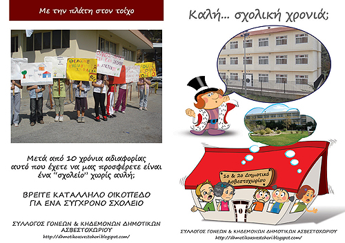 Την ευθύνη της σχολικής στέγης την έχει από ότι γνωρίζω ο δήμαρχος αλλά και ο νομάρχης της κάθε περιοχής. Από ότι φαίνεται η γη στην περιοχή έχει αξία μόνο αν κτιστούν μεζονέτες ή εμπορικά κέντρα, οπότε και οι τοπικοί “άρχοντες” έχουν χεσμένους τους κατοίκους.