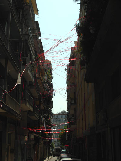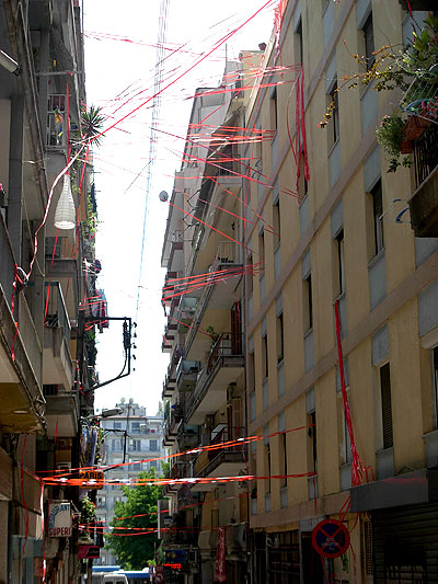 Διαβάζω στο σημερινό ένθετο της εφημερίδας “ΤΑ ΝΕΑ”, “Ζω στη Θεσσαλονίκη”, που δυστυχώς δεν είναι η ύλη του on-line, το πείραμα της Αγγελικής Μακρή, φοιτήτρια της Σχολής Καλών Τεχνών στην πόλη. Η γυναίκα 6 χρόνια στον δρόμο μπούχτισε και αποφάσισε συμβολικά να ενώσει τους γείτονες. Αφού τους ενημέρωσε με φυλλάδια αλλά και κατ’ ιδίαν, για το σχέδιό της. θα ένωνε με κόκκινες κορδέλες τα μπαλκόνια, έτσι ώστε αυτές να συμβολίχζουν γραμμές επικοινωνίας μεταξύ τους. Παρ’ όλη την δυσκολία από τους οικογενειάρχες της περιοχής κατάφερε την Τετάρτη 14/05/2008 να ενώσει κάποια μπαλκόνια δίνοντας την εικόνα που βλέπεται στις φωτογραφίες.