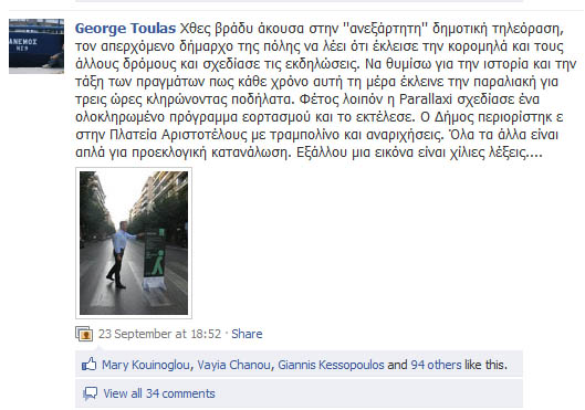 Στο θέμα μας όμως. Η Παράλλαξη αποφάσισε να συνεχίσει την λογική του Θεσσαλονίκη αλλιώς για ένα απόγευμα σε συνεργασία με τον Δήμο θεσσαλονίκης και τον εμπορικό σύλλογο, την μέρα χωρίς αυτοκίνητο στις 22 Σεπτεμβρίου. Μια μέρα πριν ο Μιχάλης Γουδής παρουσίασε, για λογαριασμό της παράλλαξης, την ιδέα του Θεσσαλονίκη αλλιώς, στην κατάμεστη αίθουσα του Δάϊος, στο πλαίσιο του Opeencoffee. Αυτό που συγκράτησα, σαν είδηση, είναι οι σκέψεις που είχε η ομάδα της παράλλαξης στο να δώσει μια νομική υπόσταση στην ιδέα του αλλιώς, αλλά όχι αυτή της ΜΚΟ.