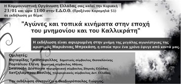 Ο τίτλος της εκδήλωσης είναι “Αγώνες και τοπικά κινήματα στην εποχή του μνημονίου και του Καλλικράτη“. Η εκδήλωση θα γίνει στο μέγαρο της ΕΔΟΘ, Προξένου Κορομηλά 51 την Κυριακή 23/1 στις 11:30 το πρωί. Ομιλητές θα είναι ο δημοτικός σύμβουλος Θεσσαλονίκης, Τριαντάφυλλος Μηταφίδης, η δημοτική σύμβουλος Αθήνας Πορταλιού Ελένη, η περιφερειακή σύμβουλος Στερεάς Ελλάδας Σπανούδη Δέσποινα και ο περιφερειακός σύμβουλος Δυτ. ΕΛλάδας Χατζηλάμπρου Βασίλης.