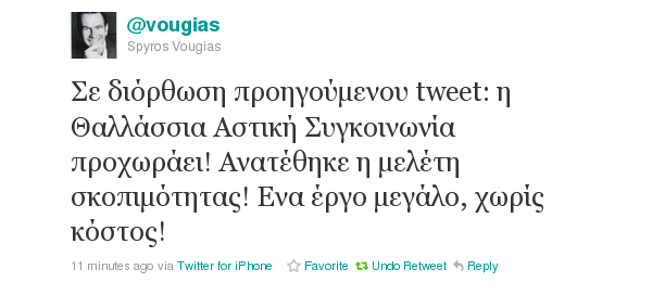 Ενώ θα περιμέναμε ανακοινώσεις σχετικά με το πολύπαθο έργο του Μετρό (1,2), ή μια ανακοίνωση σχετικά με την σωστή πρωτοβουλία της κυβέρνησης να εξερευνήσει την δυνατότητα ανάπτυξης της αστικής θαλάσσιας συγκοινωνίας, ο Υφυπουργός Υποδομών Μεταφορών Σπύρος Βούγιας μέσω Twitter νεκρανάστησε ένα από τα πιο αμφιλεγόμενα έργα για τους Θεσσαλονικείς.