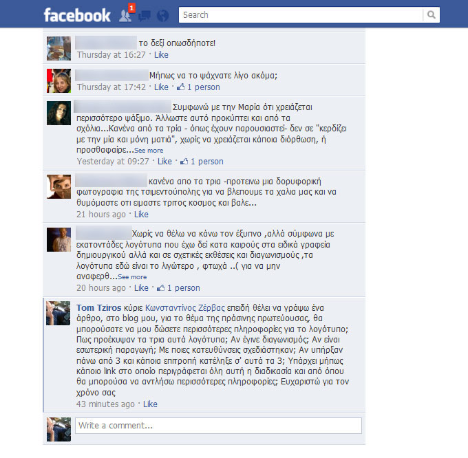 Και στην συνέχεια η δική μου: “Καταρχάς σας τιμά ότι απαντήσατε. Αλλά δεν θα συμφωνήσω με αυτήν. Καταρχάς με αυτόν την συγκεκριμένη διαδικασία απαξιώνεται το επάγγελμα του γραφίστα. Από την άλλη μου ακούγεται πολύ περίεργο 3 διαφορετικοί γραφίστες της πόλης μας να θέλουν να κρατήσουν την ανωνυμία τους αντί να προβληθούν μέσα από την ευγενική τους χορηγία προς την πόλη τους. Αστεία πράγματα. Δεν νομίζω να το πιστέψει κανείς. Και στην τελική πως έμαθαν η συγκεκριμένοι για την προσπάθεια και προσφέρθηκαν. Δεν νομίζω να έγινε καμιά ανακοίνωση στα ΜΜΕ. Δεν θα ήθελα να συζητήσω καθόλου για την ποιότητα των προσχεδίων ούτε για την καταλληλότητα τους. Εύχομαι στο μέλλον να ακολουθήσετε διαδικασίες με μεγαλύτερη διαφάνεια και όχι εκμεταλλευόμενοι δωράκια! (την απάντησή σας όπως και την δική μου οφείλω να την δημοσιεύσω στο post του profil μου)”Panagiotis Prive Metallinos Και οι απαντήσεις συνεχίζονται από τον κ. Κωνσταντίνο Ζέρβα “Το “περιεργο” και το “αστειο” ειναι τελειως υποκειμενικο θεμα! Το “δωρακια” ενεχει δολο και σας παρακαλω να το αποσυρετε. Η αφιλοκερδης προσφορα στις δυσκολες μερες και προσπαθειες στο Δημο και στη χωρα πρεπει να βρισκει μιμητες και οχι επικριτες!”