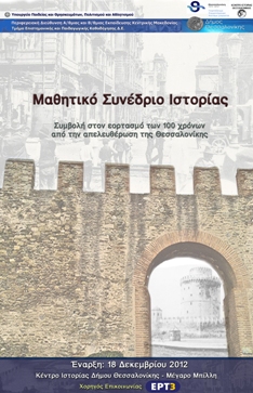 Η Περιφερειακή Διεύθυνση Εκπαίδευσης Κεντρικής Μακεδονίας, ειδικότερα το Τμήμα Επιστημονικής και Παιδαγωγικής Καθοδήγησης Δ.Ε. και Σχολικοί Σύμβουλοι Δευτεροβάθμιας Εκπαίδευσης, με την υποστήριξη του Δήμου Θεσσαλονίκης και το Κέντρο Ιστορίας Θεσσαλονίκης διοργανώνουν Μαθητικό Συνέδριο Ιστορίας. Το Συνέδριο θα πραγματοποιηθεί στο Κέντρο Ιστορίας Θεσσαλονίκης από 18 – 21 Δεκεμβρίου 2012, ώρα έναρξης 09:00.