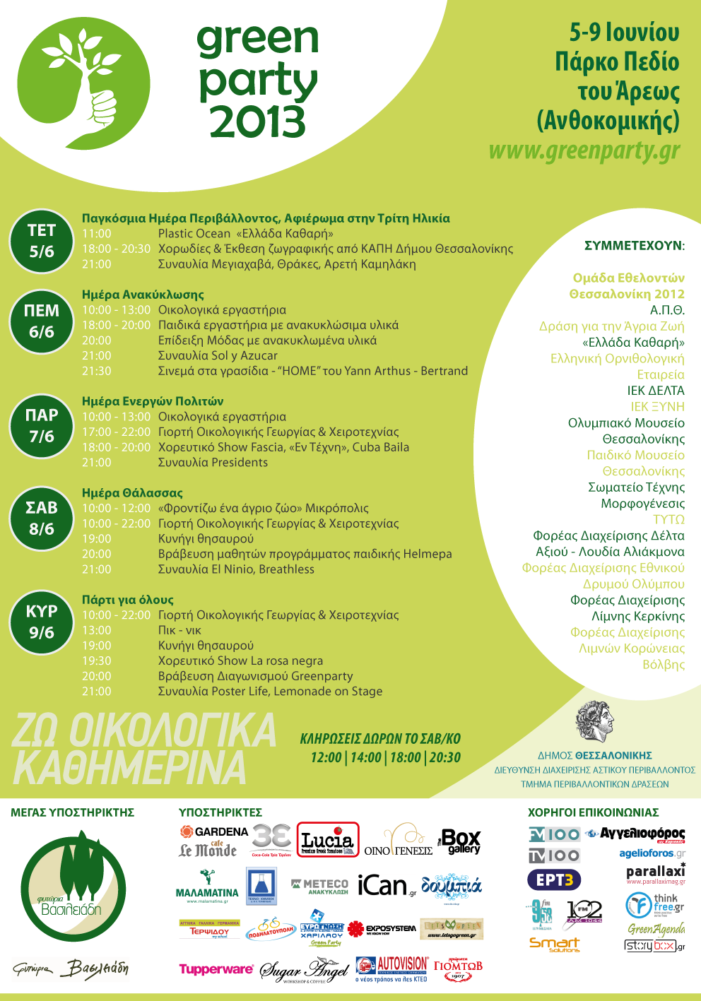 10:00- 22:00 Plastic Ocean, Γιορτή Οικολογικής Γεωργίας & Χειροτεχνίας, Έκθεση με καλλιτεχνικές θαλασσινές δημιουργίες από μαθητές– μέλη της παιδικής Helmepa, Face Painting,Οικολογικά εργαστήρια & παιχνίδια για μικρούς και μεγάλους από Φορείς Διαχείρισης Προστατευόμενων Περιοχών (Δέλτα Αξιού – Λουδία Αλιάκμονα, Λιμνών Κορώνειας- Βόλβης, Λίμνης Κερκίνης, Εθνικού Δρυμού Ολύμπου), Ορνιθολογική, ΑΠΘ, «Μορφογένεσις», ΙΕΚ ΞΥΝΗ, Τμ. Ανακύκλωσης (5η Δημ. Κοιν.)
