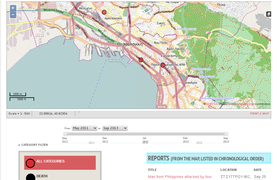 Πρώτα ένα δημοσίευμα της εφημερίδα Guardian που συγκεντρώνοντας στοιχεία από το crisis-scape.net μίλησε κυρίως για ρατσιστικές επιθέσεις στην Αθήνα. Το crisis-scape.net καταγράφει και κάποιες λίγες επιθέσεις στην Θεσσαλονίκη, μικρότερες σε αριθμό από της Αθήνα αλλά παρόλα αυτά υπαρκτές.