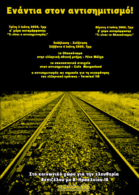 Εκδήλωση ενάντια στον αντισημιτισμό θα πραγματοποιηθεί το αύριο, Σάββατο 6 Ιουνίου, στο νέο κοινωνικό χώρο για την ελευθερία στην Β. Ηρακλείου 18 και Βενιζέλου. Θα μιλήσουν η Ρένα Μόλχο, Cafe Morgenland & Terminal 119. Δυστυχώς τις πληροφορίες τις έχω από μια αφίσα που είδα στου abravanel. Περισσότερα αύριο