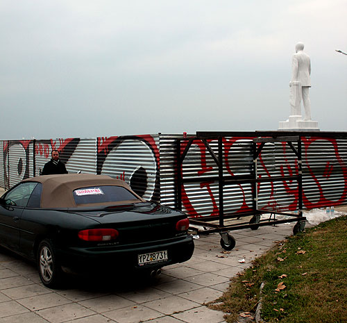Αυτό που μου έκανε εντύπωση, πέρα από το παράταιρο του αγάλματος, ήταν δυο αυτοκίνητα παρκαρισμένα, παράνομα, πάνω στο πλακόστρωτο της παραλίας. Είχαν συμβατικές πινακίδες μόνο που το ένα έγραφε ξεκάθαρα ότι ήταν της εταιρίας σεκιούριτι ΔΡΑΣΙΣ ενώ το άλλο, το μόνο που έγραφε ξεκάθαρα ήταν ότι πωλείται.