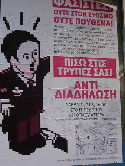 Όσοι μείνουν σήμερα στην πόλη μπορούν να γνωρίσουν τις ομορφιές του Ευόσμου. Δυτικός δήμος της πόλης με ονομαστή ομάδα τον Αγροτικό Αστέρα. Πέριξ του γηπέδου αναμένονται μάχες μεταξύ Χρυσαυγιτών που αποφάσισαν να διαδηλώσουν κατά τις ακρίβειας και αντεξιουσιαστών που αποφάσισαν να διαδηλώσουν κατά των Χρυσαυγιτών. Με κίνδυνο να χαρακτηριστεί μονομερής η κάλυψη του θέματος, αναρτώ την αφίσα των αντεξουσιαστών μια και μόνο αυτή βρήκα στην πόλη και έσπαγα το κεφάλι μου να καταλάβω γιατί διαδηλώνουν. Ευτυχώς η Magica με ενημέρωσε και για το πρώτο σκέλος.